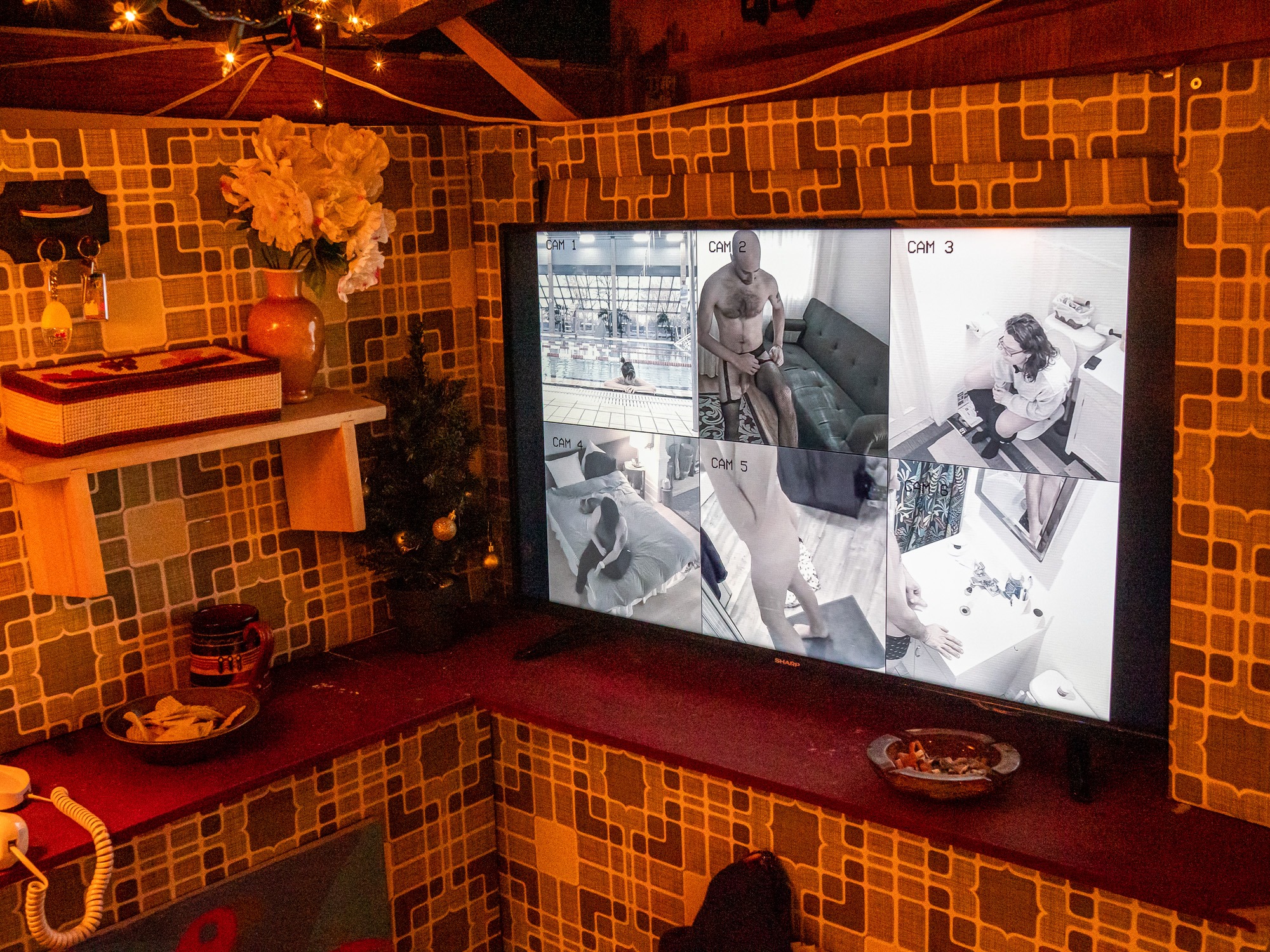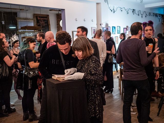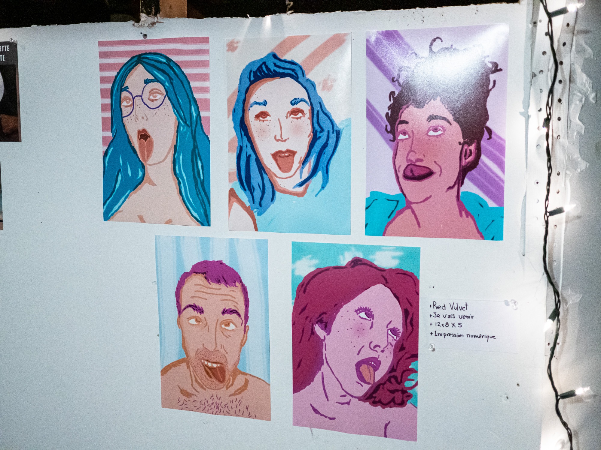 Public absorbé par l’expérienc proposée par l’installation de valerielartiste – Installation de Audrey Desrosiers explorant les tabous – Oeuvres de Red Vulvet, Affichage des Hardcorettes (Projet de Ed Hardcore) par Caroline san et Audrey Desrosiers, Kink Art 2 au Café rond point à Montréal.